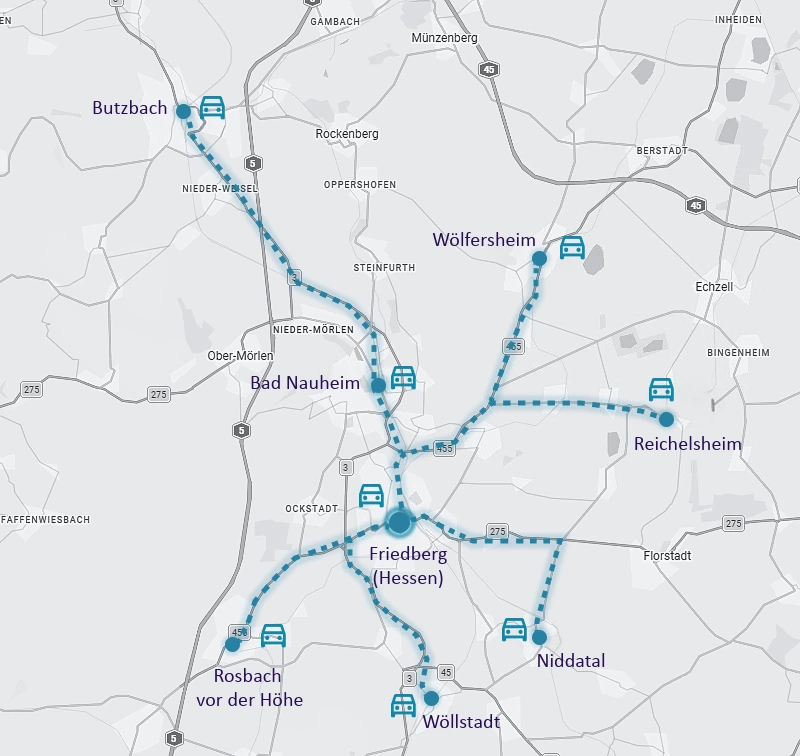 Friedberg, Bad Nauheim, Wöllstadt, Wölfersheim, Niddatal, Rosbach vor der Höre, Reichelsheim, Butzbach